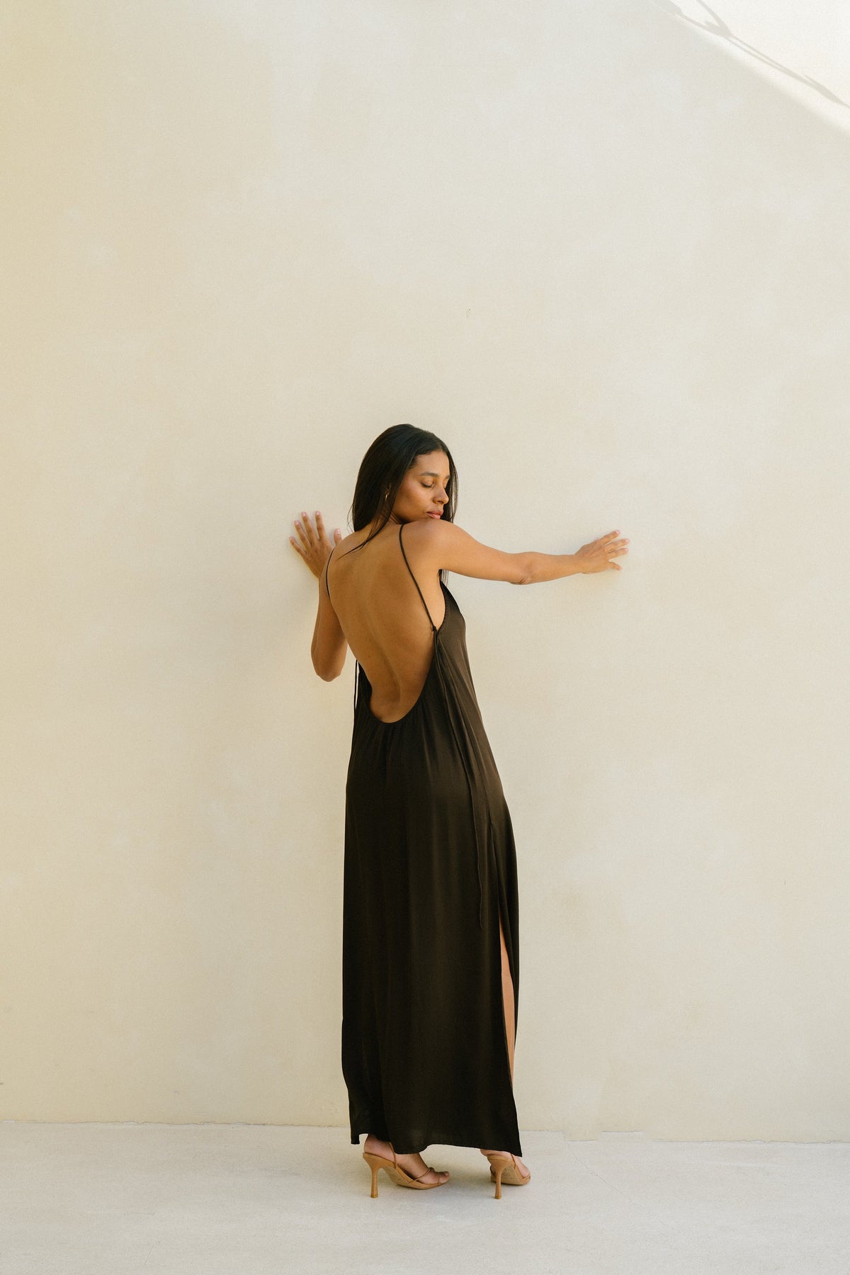 Versatile slip Dress. Featuring adjustable loop ties to style straps straight back or wear as a halter. Statement low back with side splits. Made from our soft satin blend.