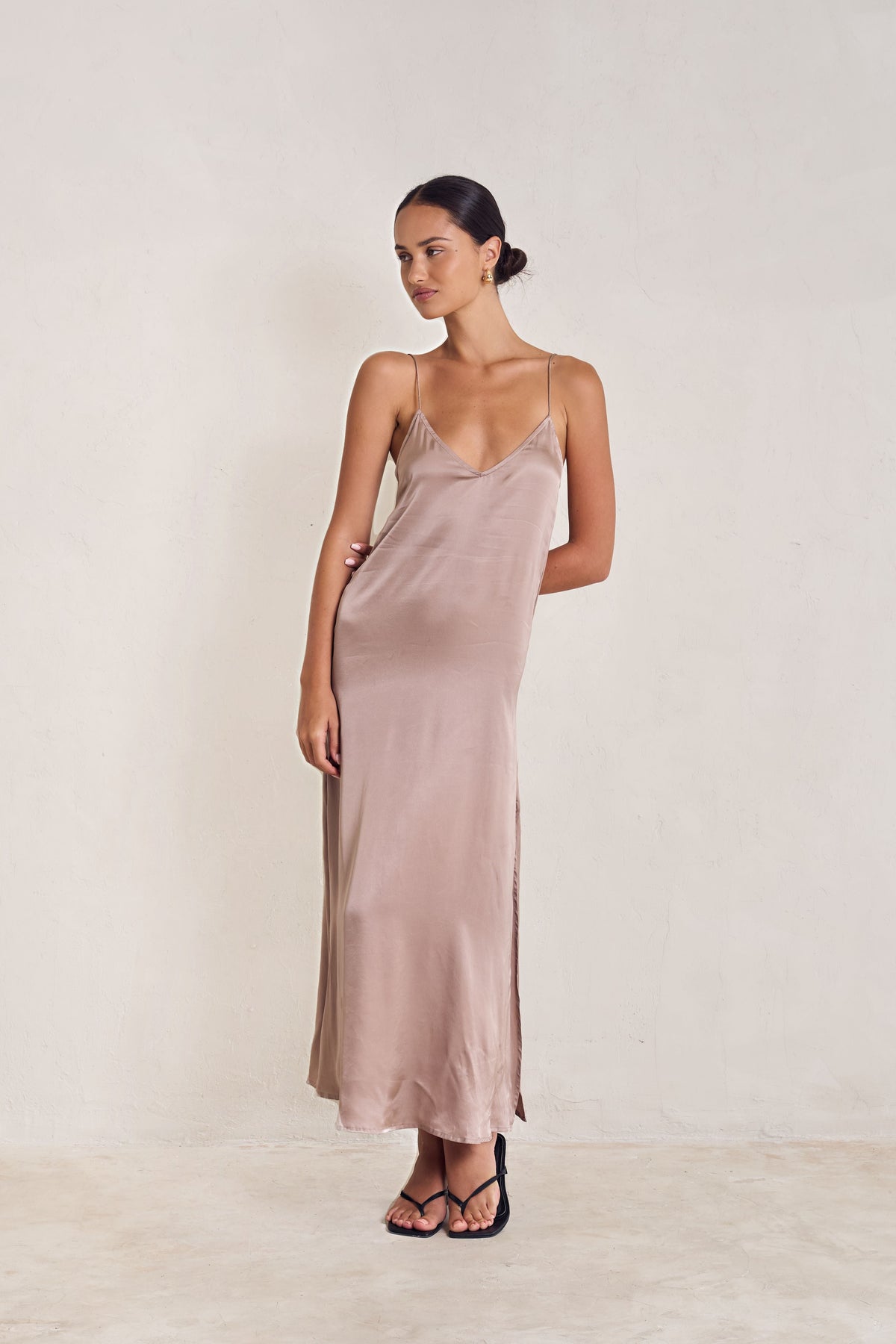 The effortlessly elegant SLIP will have you captivated. With a flattering neckline, low back and high side slits. Customize the look with adjustable straps worn over the shoulder, or crossed over the back.